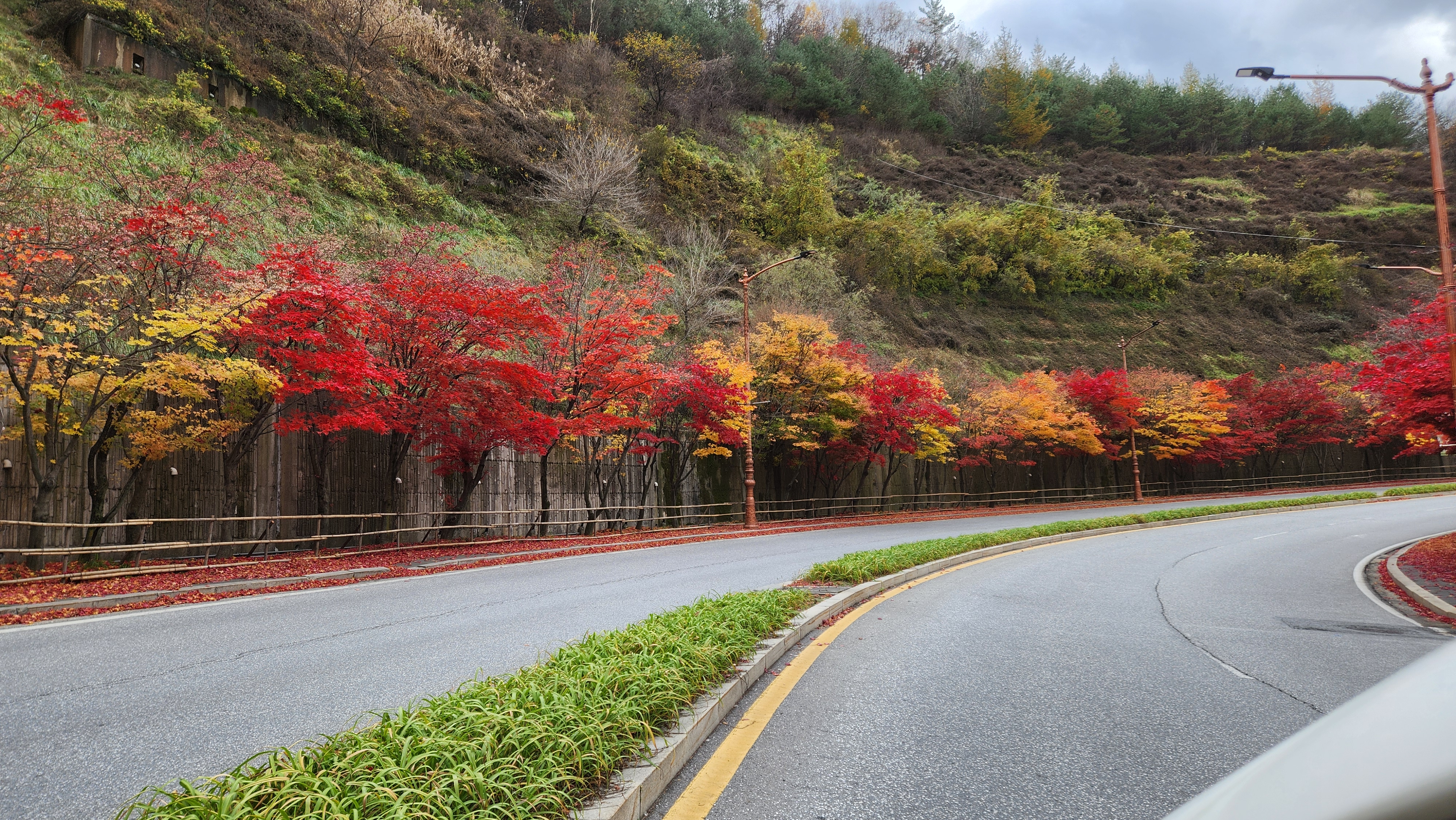 간혹, 정말 간혹 눈에 띄는 빨간색 단풍은 상대적으로 햇볕이 적게 드는 그늘에서만 발견할 수 있었다. 아래는 하이원 리조트 입구에 줄지어 있는 빨간색 단풍들의 모습. 높은 축대를 등지고 있어 자주 그늘이 지는 곳이다.