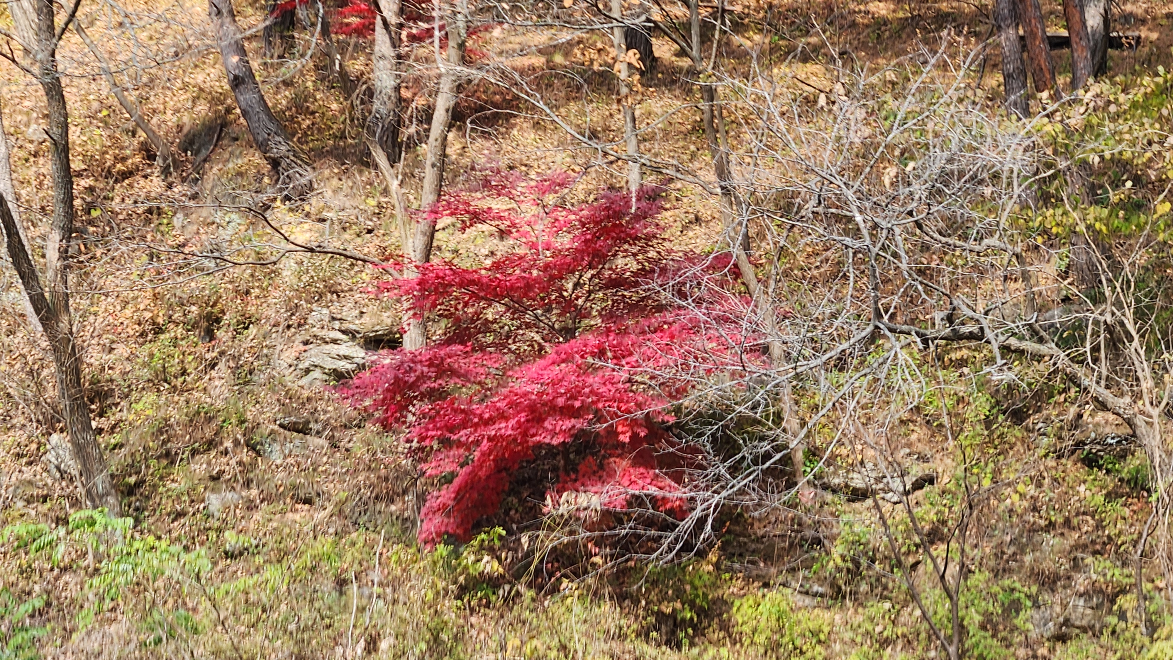 아래는 병방치 스카이워크 올라가는 길에 발견한 빨간 단풍의 모습이다. 주변에도 몇 그루 있었을 것 같은데... 저 한그루만 남았다. 빨갛게 변하기 전에 모두 떨어져 버린 것이 아닐까 싶다.