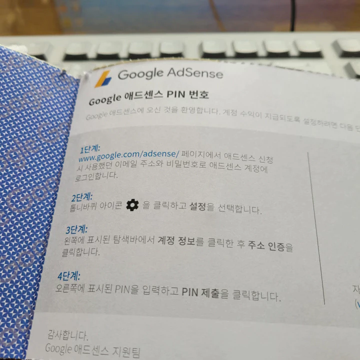 서신에는 6자리 핀번호가 들어있다. 애드센스에 접속해서 6자리 핀번호를 입력하고 계좌정보를 입력하면 드디어… 언젠가는 수익이 지급될 나의 계좌가 등록된다.
