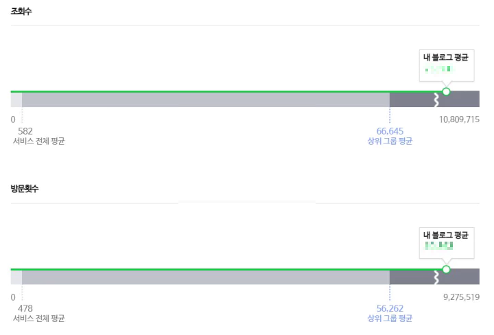 아래는 네이버에서 제공하는 '블로그 평균 데이터'인데요. '상위 5만 개 블로그의 한 달 평균 데이터'와 제 블로그의 데이터를 비교해보면 조회수, 방문 횟수, 방문자수, 게시글 평균 사용 시간 등의 모든 수치에서 제 블로그가 높게 나옵니다.