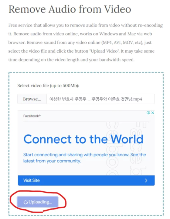'Upload video' 버튼을 누르면 'Uploading'으로 바뀌고 시간이 소요됩니다. Uploading 프로세스에서 소리 제거까지 모두 끝납니다. Uploading 이후 별도의 '동영상 소리 제거 프로세스'는 없습니다.