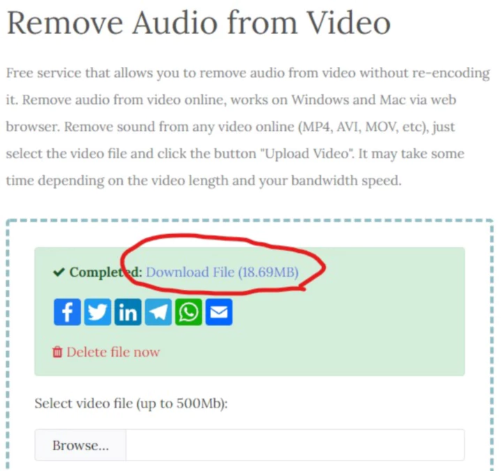 워낙 Simple 하게 만들어진 웹사이트이므로 디자인이 훌륭하지는 않습니다. 'Download File'이라는 버튼이 눈에 잘 보이지 않을 수 있으니 아래 그림 보시고 잘 찾으시길 바랍니다. 그 버튼을 클릭하면 소리가 제거된 동영상이 다운로드됩니다. 다운로드 받아보시면 동영상 소리가 잘 삭제(오디오 제거)된 것을 확인하실 수 있습니다.