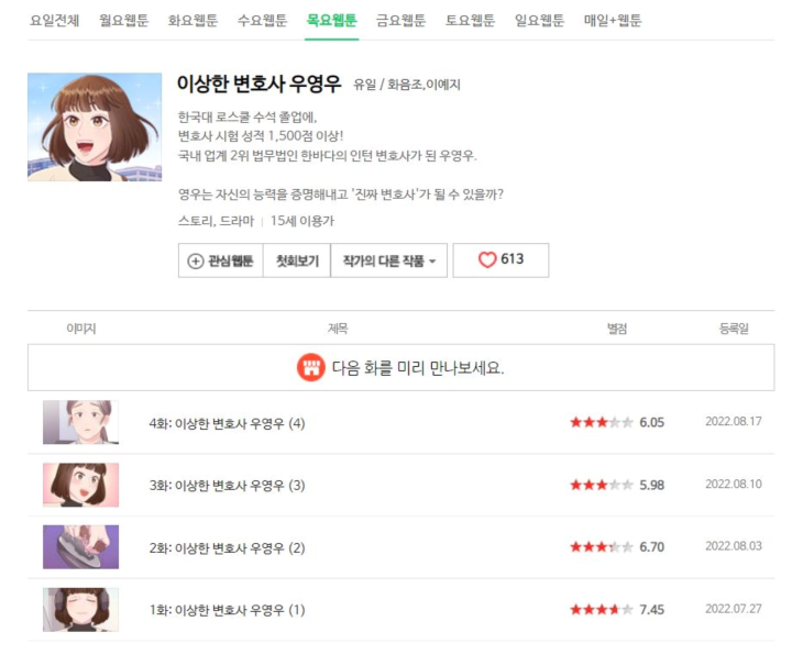 허탈한 마음에 혹시나 해서 우영우 웹툰을 찾아봤습니다. 얼마 전에 시작했는지 4편 정도 있던데요. 내용은 정말 똑같더라고요. 머... 잘 되기를 바랍니다.