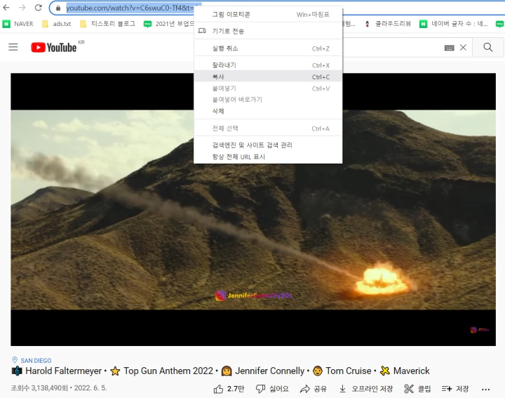 1. 먼저 4K 비디오 다운로더 프로그램을 실행시킵니다. 그 다음 유튜브에서 다운로드하고자 하는 동영상의 URL을 클릭해서 복사(copy)합니다. 샘플 영상으로는 제가 좋아하는 영화, 탑건 매버릭의 예고편을 골랐습니다.
