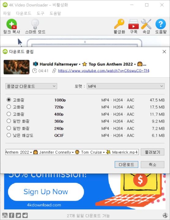 1. 먼저 4K 비디오 다운로더 프로그램을 실행시킵니다. 그 다음 유튜브에서 다운로드하고자 하는 동영상의 URL을 클릭해서 복사(copy)합니다. 샘플 영상으로는 제가 좋아하는 영화, 탑건 매버릭의 예고편을 골랐습니다.
