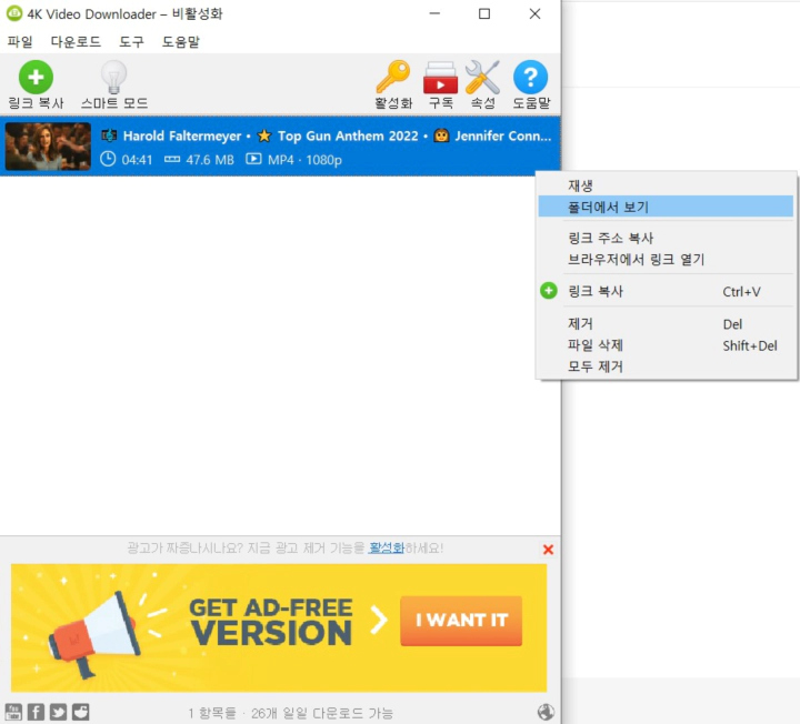 다운로드가 끝나면 리스트에 동영상이 나타납니다. 오른쪽 마우스 클릭해서 '폴더에서 보기'를 선택하면 폴더에 저장된 동영상 파일이 보이실 겁니다.