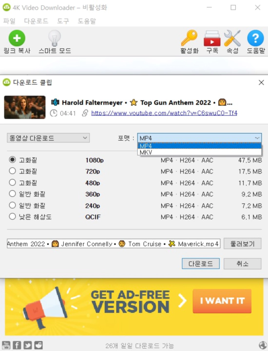 동영상의 포맷을 선택할 수도 있습니다. MP4와 MKV 포맷을 지원합니다.
