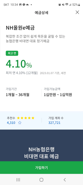 그런데...! 23년 1월 살펴보니 NH올원e예금 금리가 4.1%로 급락했습니다. 4.1%라면 1금융권, 즉 은행권 정기예금 중 가장 낮은 수준입니다. 심지어 KB국민은행의 정기예금보다 낮은 것 같네요. 어찌 된 일일까요? 불과 2~3주 만에 갑자기 이럴 수 있는 것인지 당황스럽네요. 특별히 한국은행 기준금리가 내린 것도 아닌데 말입니다.