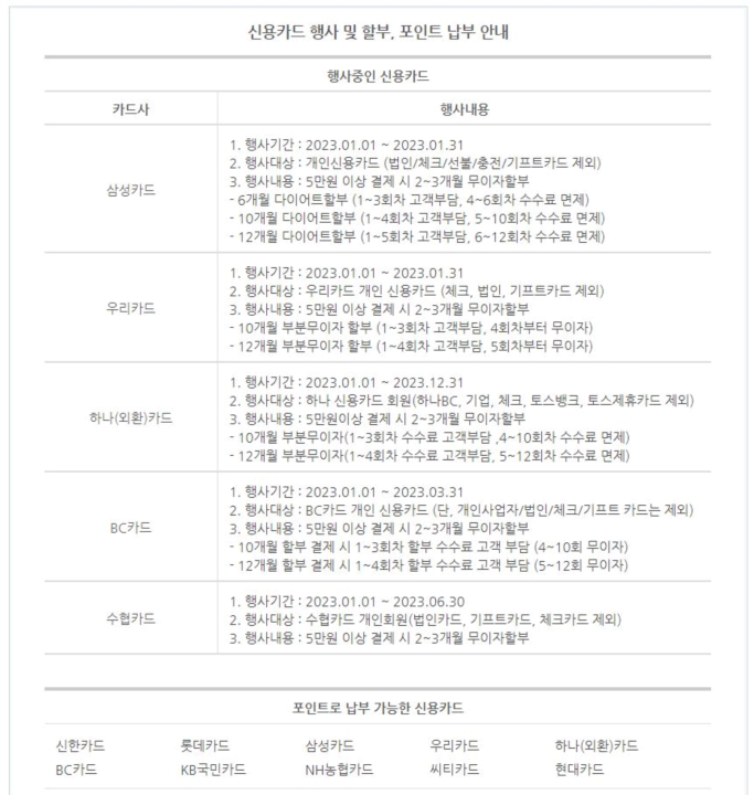 무이자 할부 행사를 진행 중인 카드사들도 있었는데요. 어떤 카드사들이 행사를 하는지 서울시 모바일 etax에서는 한눈에 보기가 어려웠습니다. 대신 etax PC 웹에는 아래와 같이 잘 나와 있었습니다. 삼성, 우리, 하나, BC, 수협 카드에서 2~3개월 무이자 할부 행사를 진행 중이네요. 참고하시기 바랍니다.