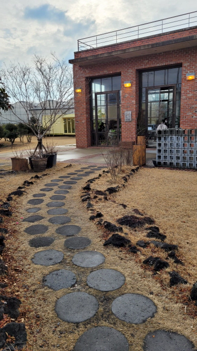카페 텐저린은 첫인상이 매우 좋다. 널찍한 주차장에 차를 대고 카페를 바라보면 음... 춘천의 제이드가든 건물(물론 규모에서 비교할 수 없지만)을 연상하게 된다. 조경에도 신경을 많이 쓴 듯하다. 카페 정문으로 들어가는 길의 조경을 아주 잘 해놓았다. 재료는 제주도를 상징하는 현무암이다.