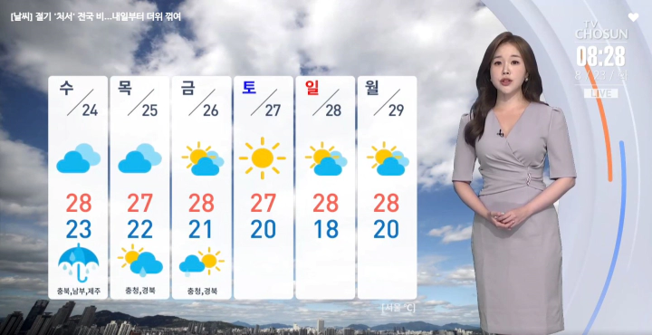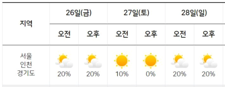 한 가지 유의하셔야 할 점이 있는데요. 내일부터는 더위가 누그러지면서 아침저녁으로 기온이 조금씩 떨어질 전망입니다. 낮에는 아직 덥겠지만 아침저녁에는 선선할 수 있으니 대비하시는 것이 좋겠습니다. 아래 사진 보시면 주말로 갈수록 아침 기온이 점점 내려가는데요. 27일 토요일에는 20도... 28일 일요일에는 18도까지 떨어진다 하네요. 사실 18도면 완연한 가을 날씨라도 봐도 무방한데요. 일교차로 인해 감기 걸리지 않도록 건강 챙기시는 것이 좋겠습니다. 하지만 낮에는 여전히 28도 선까지 올라갈 예정입니다.