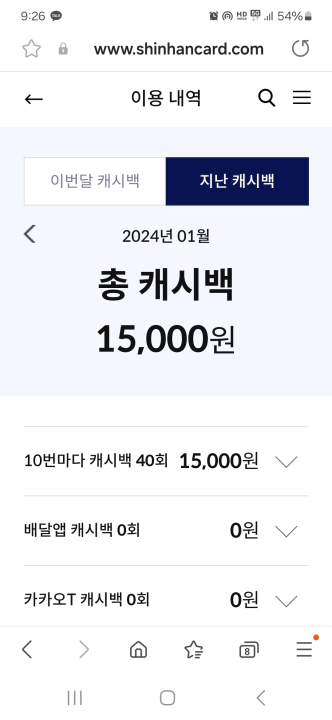 롯데카드 이벤트처럼 특별한 경우가 아니면 나는 매월 1만 5천원 이상의 캐시백을 받는다. 지난 달에도 40회의 이용 횟수 실적을 기록했고 그에 따라 총 1만 5천원의 캐시백을 받았었다.
