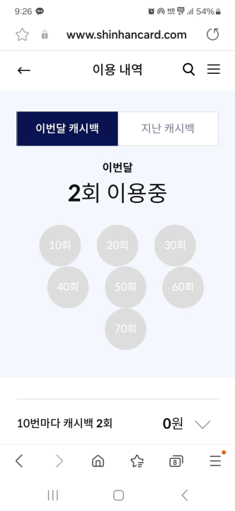 초기에는 70회 이용 횟수를 기록, 5만원의 캐시백을 받은 적도 있는데... 카드 사용자 입장에서는 정말 쏠쏠한 캐시백 혜택이 아닐 수 없다. 그동안 내가 만났던 신용카드 중 단연 최고의 캐시백이다.