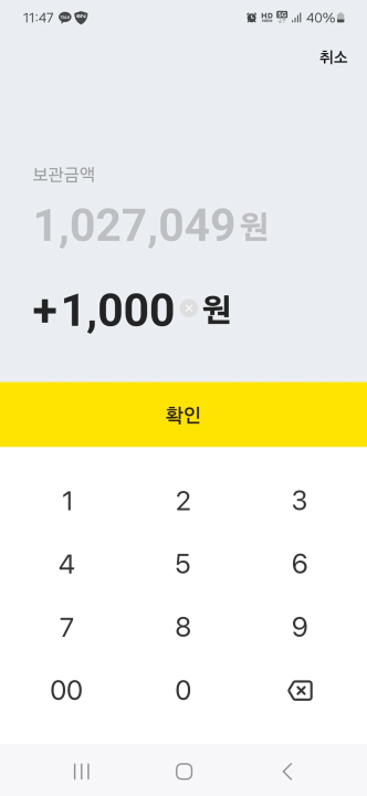 또한, 위 화면의 잔고 표시 밑에 보이는 (+)넣기, (-)빼기 버튼을 이용해 입출금을 할 수도 있다. (+)넣기를 누르면 아래 왼쪽 화면처럼 입금액을 조절할 수 있고 (-)빼기 버튼을 누르면 아래 오른쪽 화면처럼 출금액을 조절할 수 있다.