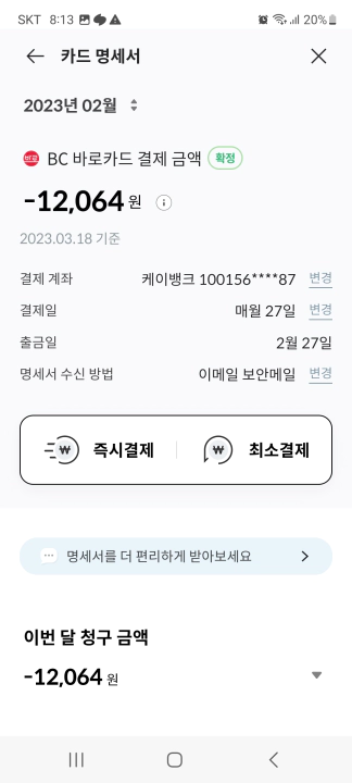 작년에는 12월부터 1월까지 두달 간, 한 달에 5만 원 이상만 결제하면 각각 2만 원씩, 총 4만 원을 청구 할인해줬었다. 그로 인해서 올해 2월과 3월의 카드 명세서는 모두 마이너스로 찍혔다. 2월 말에는 12,064원을 이미 입금 받았고 3월 말에는 2만 원이 입금될 예정. 아주 짭짤하다. ㅋ