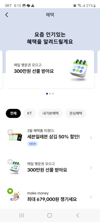 케이뱅크 심플카드 이벤트를 만나는 또 다른 방법이 하나 있는데... 케이뱅크 메인화면 우측 상단의 "혜택" 버튼을 누르고 스크롤 다운하면 이벤트 메뉴가 나타난다. 카카오뱅크나 토스뱅크에 비해서 제휴카드 이벤트가 많지 않으니 케이뱅크 사용하시는 분들은 살뜰하게 이용하시기 바란다.