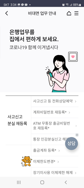 2. 아래는 고객센터 메인화면입니다. '도움이 필요하신 가요?'라고 적힌 문구 바로 아래의 '비대면 은행업무 안내'를 클릭합니다.