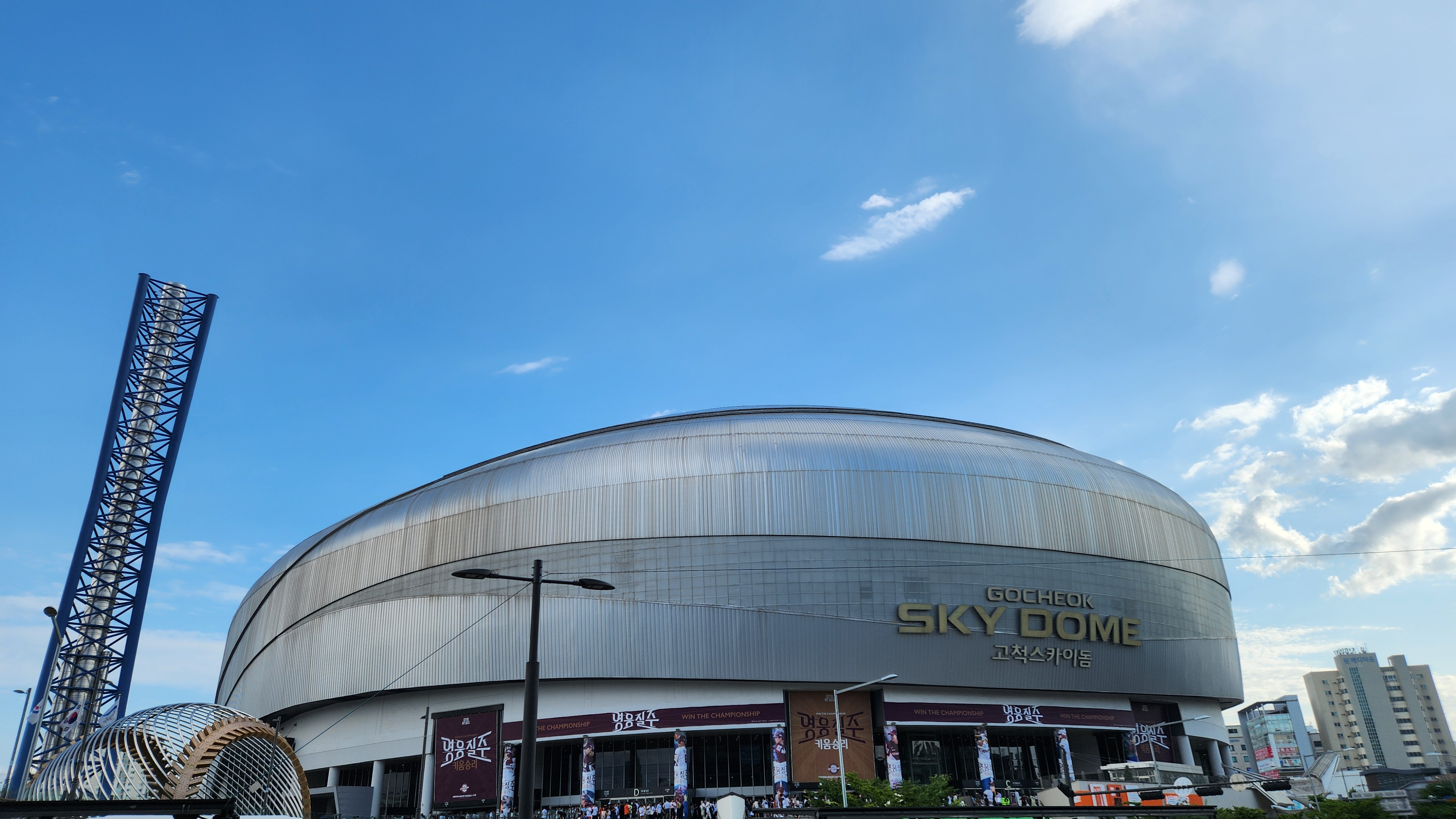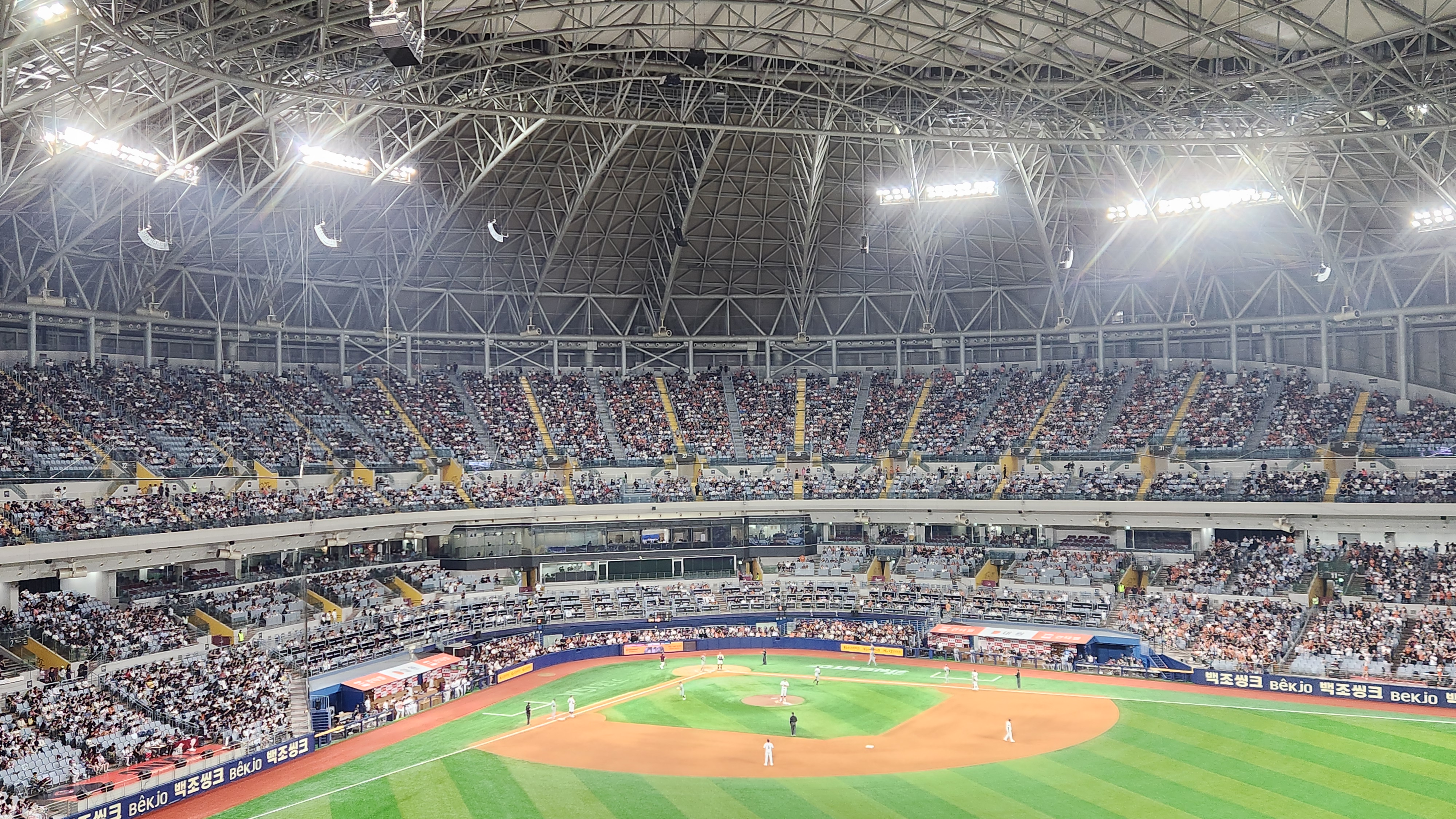 국내 하나 밖에 없는 돔구장, 고척 스카이돔의 실내에 들어서니 그 위용이 대단하다. 천장으로 덮여 하늘이 보이지 않음에도 불구하고 공간 자체가 워낙 크기에 답답함이 전혀 없다. 17,000명을 수용할 수 있는 구장은 관중으로 가득 찼다. 실내라 그런지 관중들의 응원 함성이 더 크게 울려 퍼진다.
