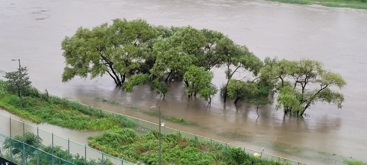 아래는 응봉교 초입에서 바라본 중랑천의 모습입니다. 한강공원 산책로는 여전히 물에 잠겨 있습니다. 중랑천 수위도 그대로인 것 같네요. 왜 수위가 전혀 줄지 않았을까... 생각을 해봤는데요. 한강 상류 쪽에도 비가 많이 왔거나 현재도 오고 있을 수 있어 그 빗물로 인해 수위가 줄지 않는 것 같기도 하고요. 상류에 있는 댐의 수위가 그동안 많이 높아져서 오늘 같이 비가 오지 않을 때 방류를 하고 있는 것이 아닐까 추측도 해봤습니다.