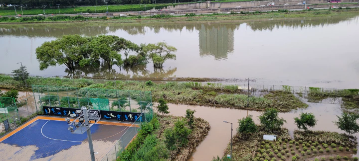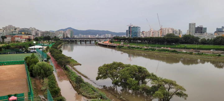 아래는 응봉교 초입에서 바라본 중랑천의 모습입니다. 한강공원 산책로는 여전히 물에 잠겨 있습니다. 중랑천 수위도 그대로인 것 같네요. 왜 수위가 전혀 줄지 않았을까... 생각을 해봤는데요. 한강 상류 쪽에도 비가 많이 왔거나 현재도 오고 있을 수 있어 그 빗물로 인해 수위가 줄지 않는 것 같기도 하고요. 상류에 있는 댐의 수위가 그동안 많이 높아져서 오늘 같이 비가 오지 않을 때 방류를 하고 있는 것이 아닐까 추측도 해봤습니다.