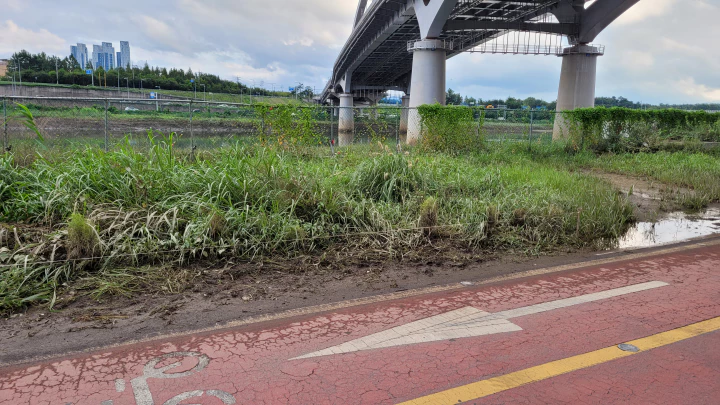 아직은 공원 정비를 제대로 하지 못한 듯합니다. 강물이 넘쳤던 흔적이 여기저기 남아있고 군데군데 토사가 보이네요. 공원 전체에서는 비릿한 냄새가 조금 납니다. 우리 막내는 공원에서 '바다' 냄새가 난다고 하더라구요. ㅋ