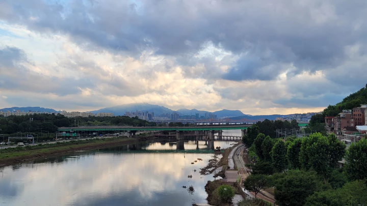 아래 사진은 응봉교에 올라서서 한강 쪽을 바라보고 찍은 사진입니다. 멀리 중랑천 끝자락에 한강과 동호대교가 보입니다. 하늘은 정말 멋집니다만... 먹구름이 잔뜩 끼어 있는 것이 오늘 밤에 비를 뿌릴 것 같습니다. 수도권에 최대 80mm의 비를 뿌린다고 합니다.