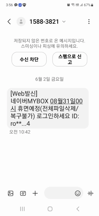 며칠 전 1588 3821로부터 문자 메시지를 받았다. 네이버 MYBOX 계정을 휴면하겠다는 경고문이었고, 로그인하지 않으면 전체 파일 삭제는 물론 복구조차 불가능하다는... 거의 협박성 내용의 메시지였다. ㅎㅎ 그런데 꼭 스팸처럼 보이는 이 메시지는 도대체 누가 보내는 걸까. T전화에도 전혀 정보가 없는 1588 3821가 어떤 전화번호인지 나는 문득 궁금해졌다.