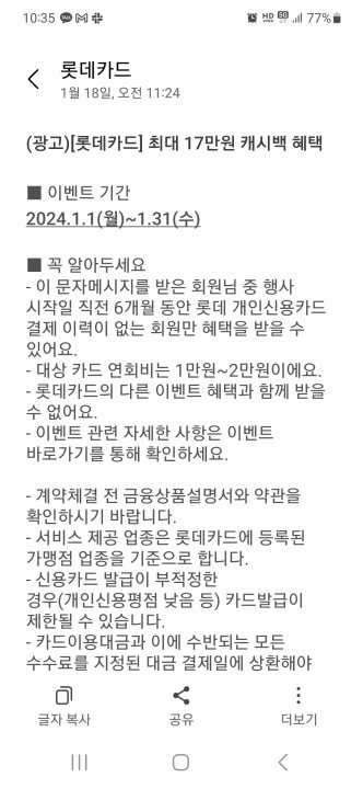 요즘 롯데카드에서 광고 문자를 많이 보낸다. 혹시나 스팸 문자가 아닌가 싶어 확인해보니 1588-8100번 롯데카드에서 보낸 문자가 맞다. 새로 카드를 발급 받고 이용하면 최대 17만원의 현금 캐시백을 제공하겠단다. Cherrysummer 로서 솔깃한 이벤트. ㅎ 그런데... 이벤트 유의사항을 살펴보니 정말 유의해야 할 사항 한가지가 보인다. 롯데카드가 이벤트를 좀 묘하게 만들어 놓았다. 혹시나 관심있으신 분들에게 도움이 될까 해서 내용 공유 드린다.