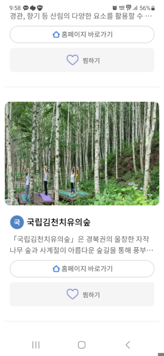 앞으로 한동안... 우리 식구들의 여행지는 전국의 숲체원과 치유의숲이 될 것이며 숲이랑 웹 서비스를 통해 예약할 듯하다. 전국 15개 시설을 돌아가며 경험하는 경우, 꽤 오랜 시간이 걸릴지도 모르겠다. ㅋ