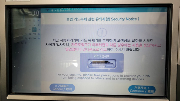 ATM에 카드 복제기를 부착해서 고객 정보를 탈취하는 경우가 있다네요. 참... 정성이 대단합니다. 한번 읽어보시고요. 우측 하단의 '거래계속' 버튼을 누릅니다.