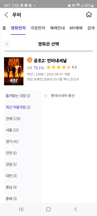 영화를 선택하고 나면 영화관을 선택하는 화면이 나타납니다. '최근 이용 극장' 리스트에 제가 자주 방문하는 '롯데시네마 용산'이 바로 보이네요.
